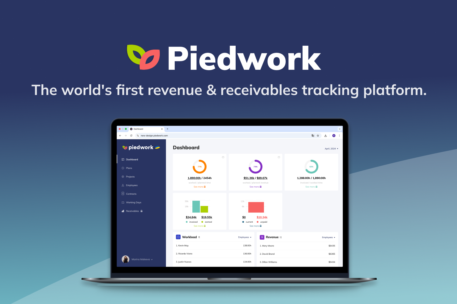 Piedwork allows you to keep track all of your company resources such as employees, managers, projects, contracts, daily task reports, monthly plans, invoices, payments, etc. and keep everything in one place accessible by your managers accordingly. All the information is being displayed properly due to best practices in accounting processes and UX terms using modern and clean media charts.