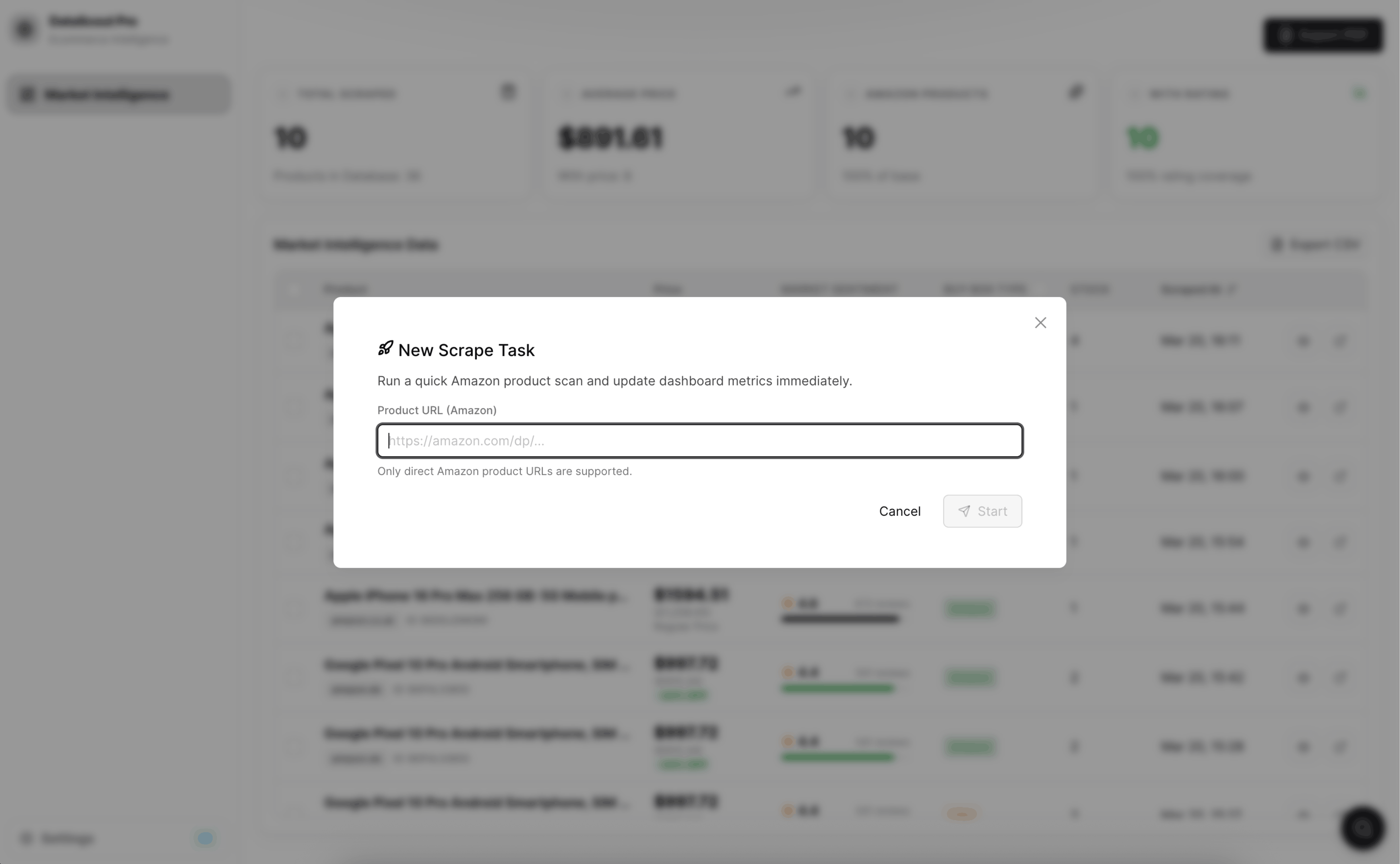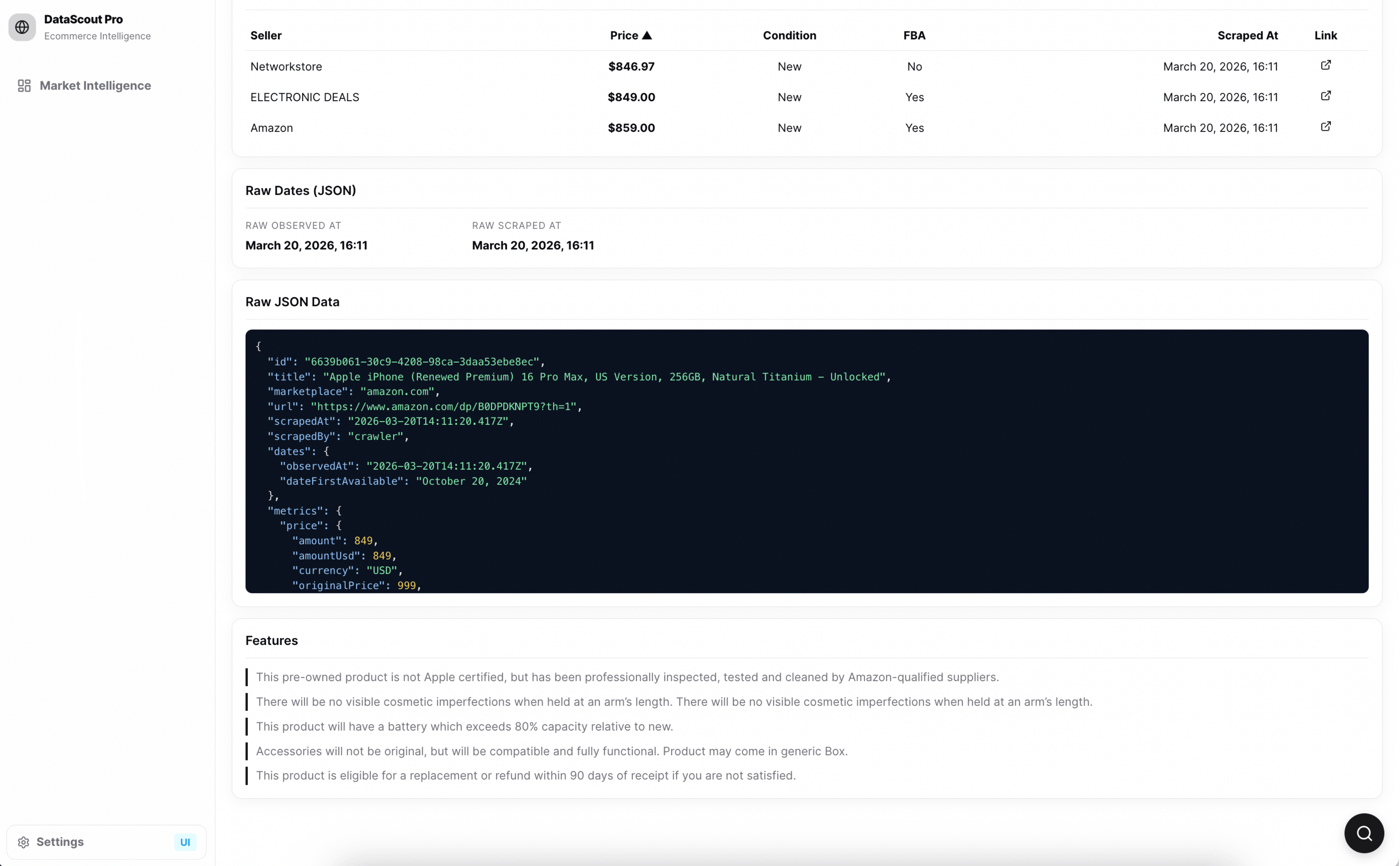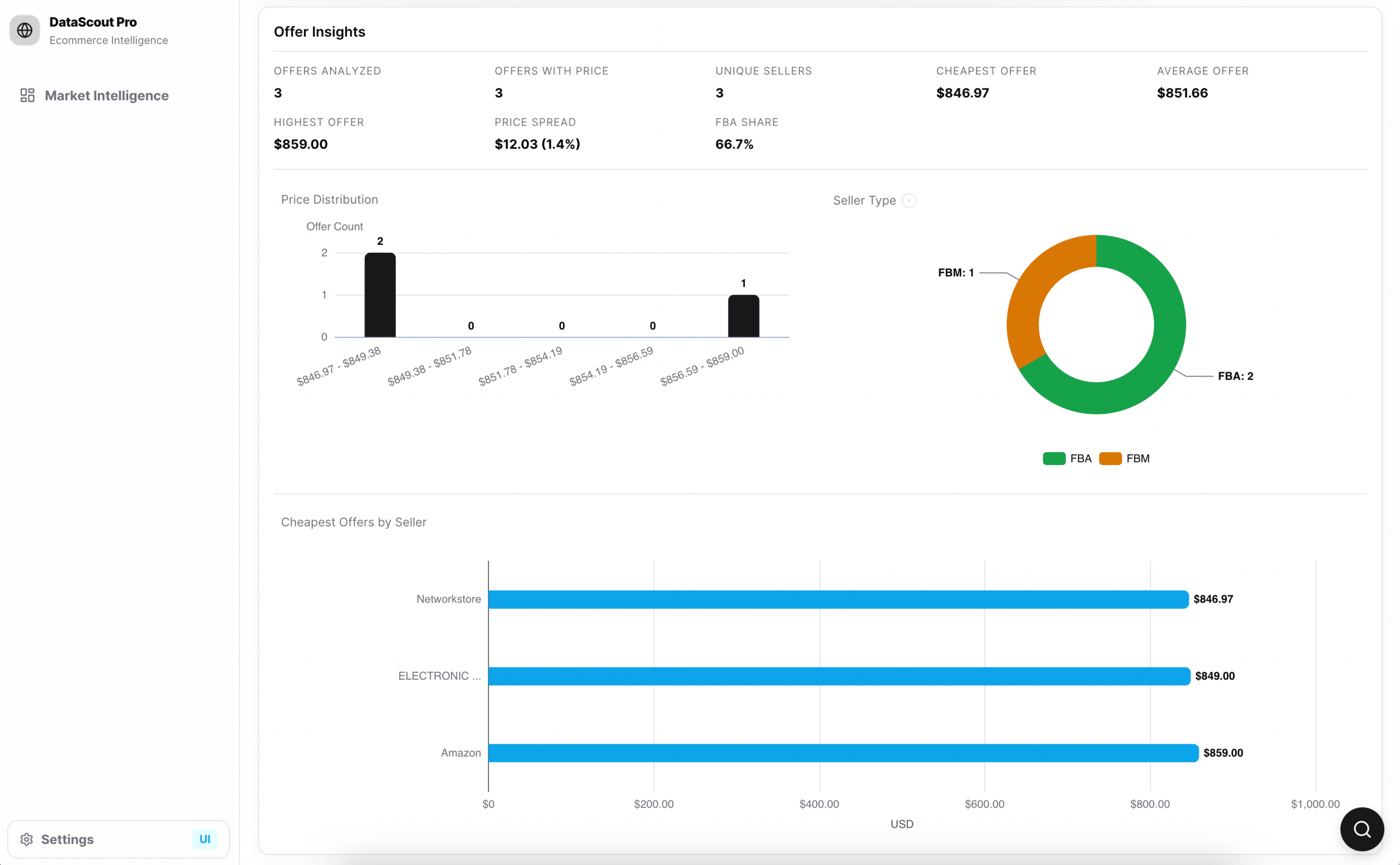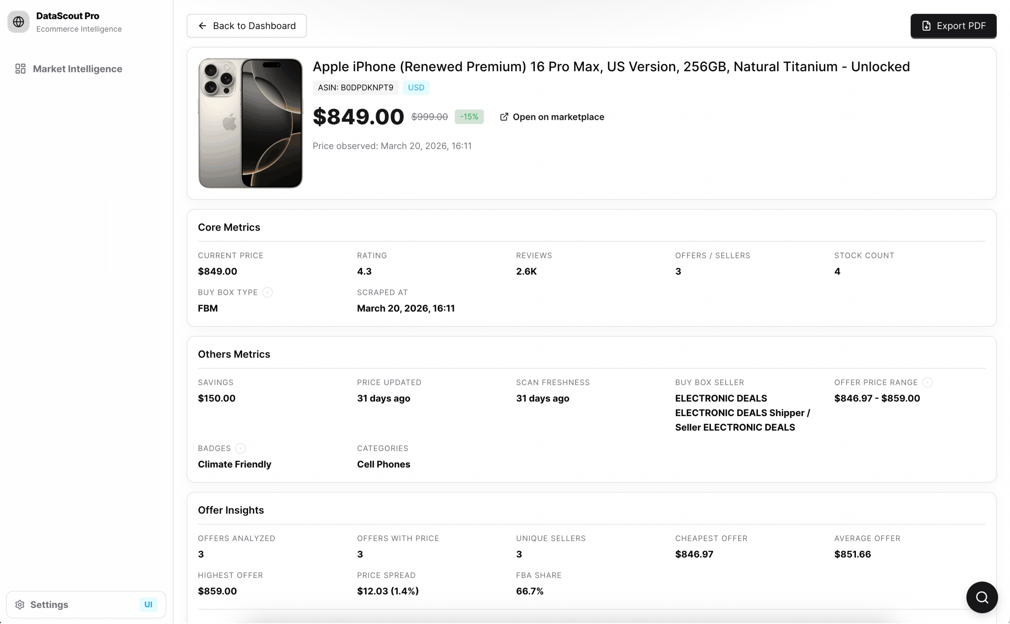 Paste any Amazon product URL and get a full market intelligence report in seconds. The tool scrapes live data across multiple marketplaces (amazon.com, amazon.co.uk, amazon.de) and returns everything you need: buy box price, rating, stock levels, FBA/FBM breakdown, active seller offers, and price distribution. Every scan is saved to your database with timestamps so you always know how fresh the data is.
