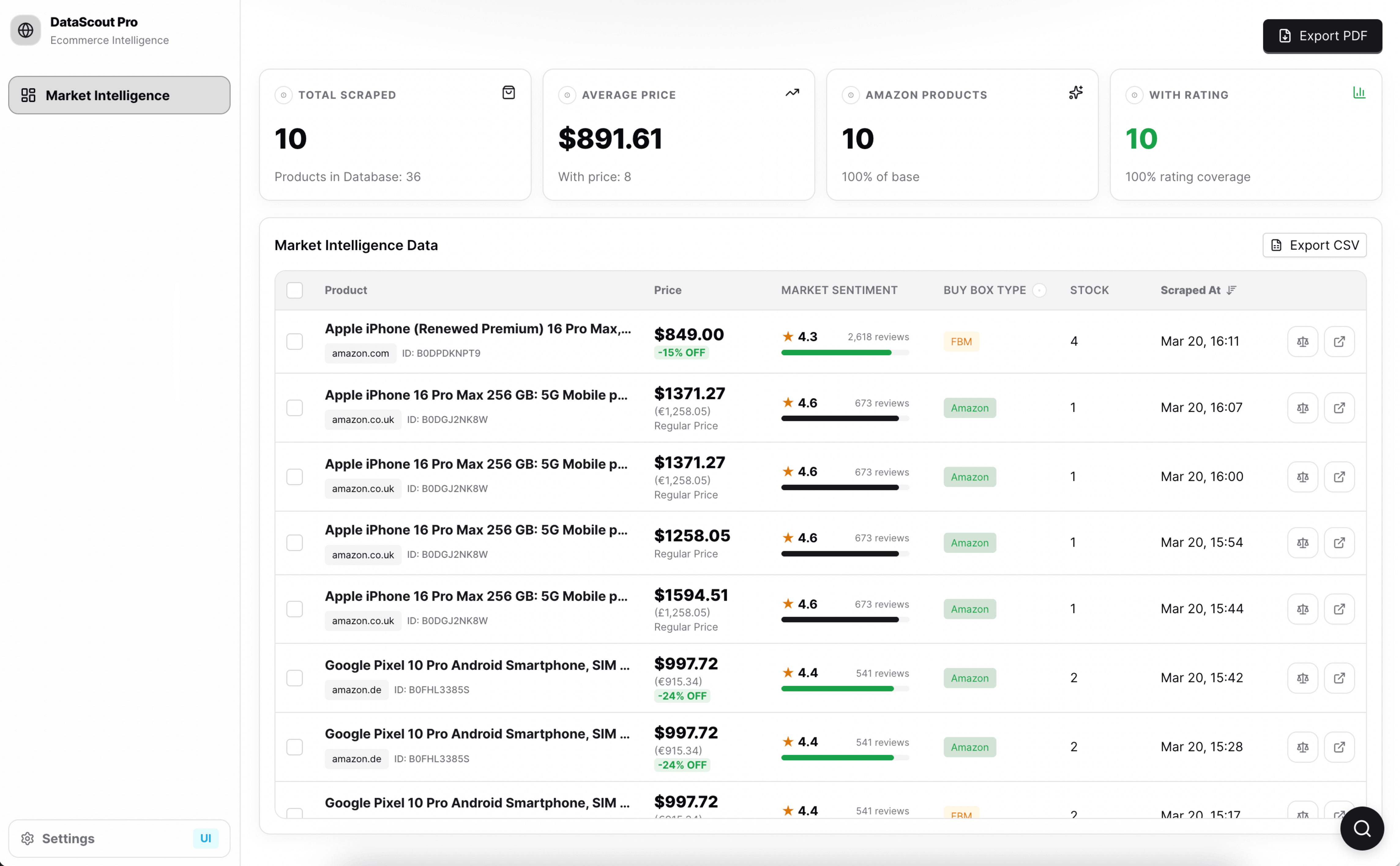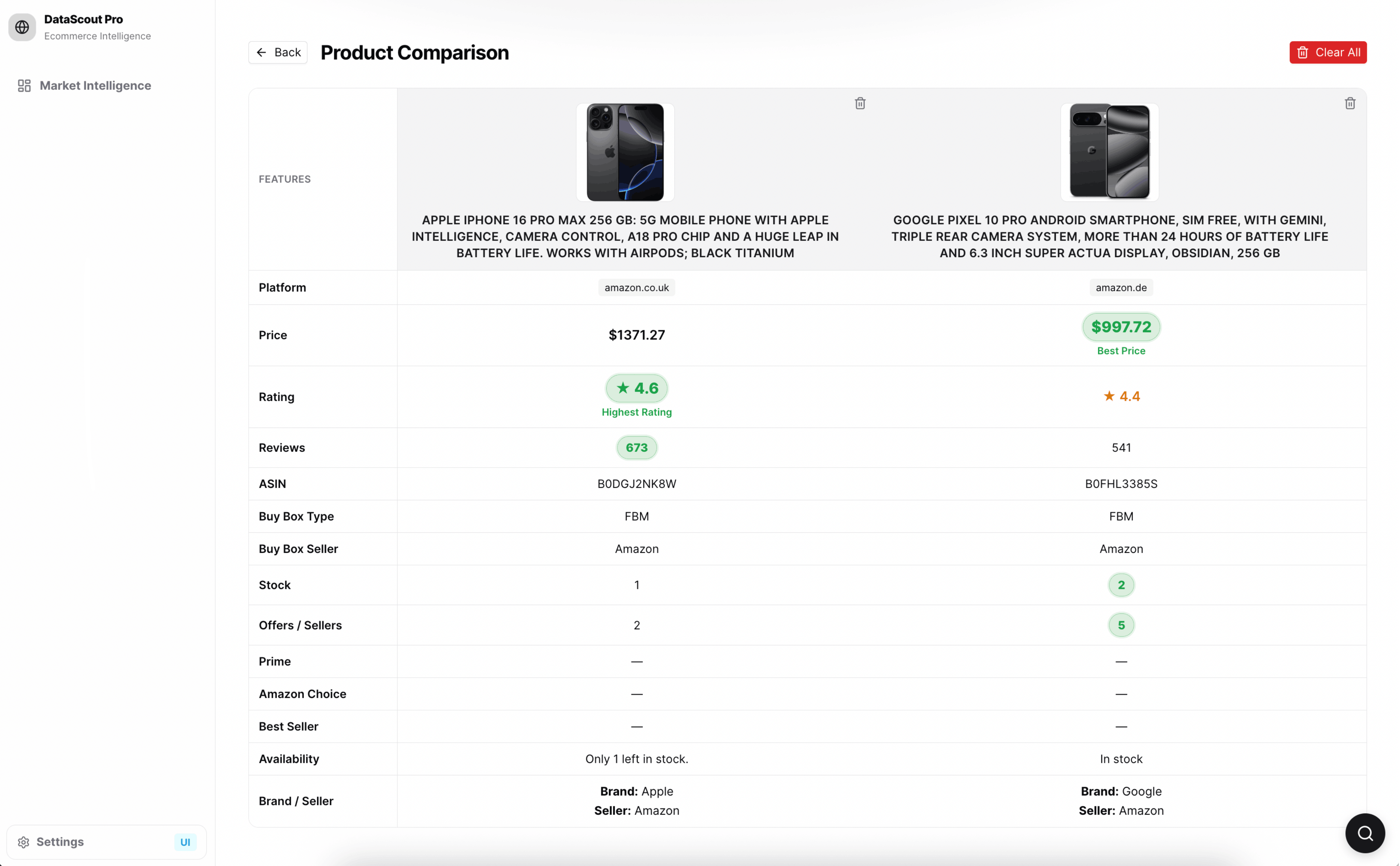Each scan is saved to your product database with a timestamp so you always know exactly how fresh the data is. From the dashboard you can sort and filter your entire dataset, spot trends across multiple scans of the same product, and export everything to CSV for further analysis or as a PDF report to share with clients. When you need to compare options, select up to 5 products and view them side by side. The comparison view automatically flags the best price and highest rating across your selection so the right choice is obvious without any extra work. It is the fastest way to go from a product URL to a confident pricing or sourcing decision.