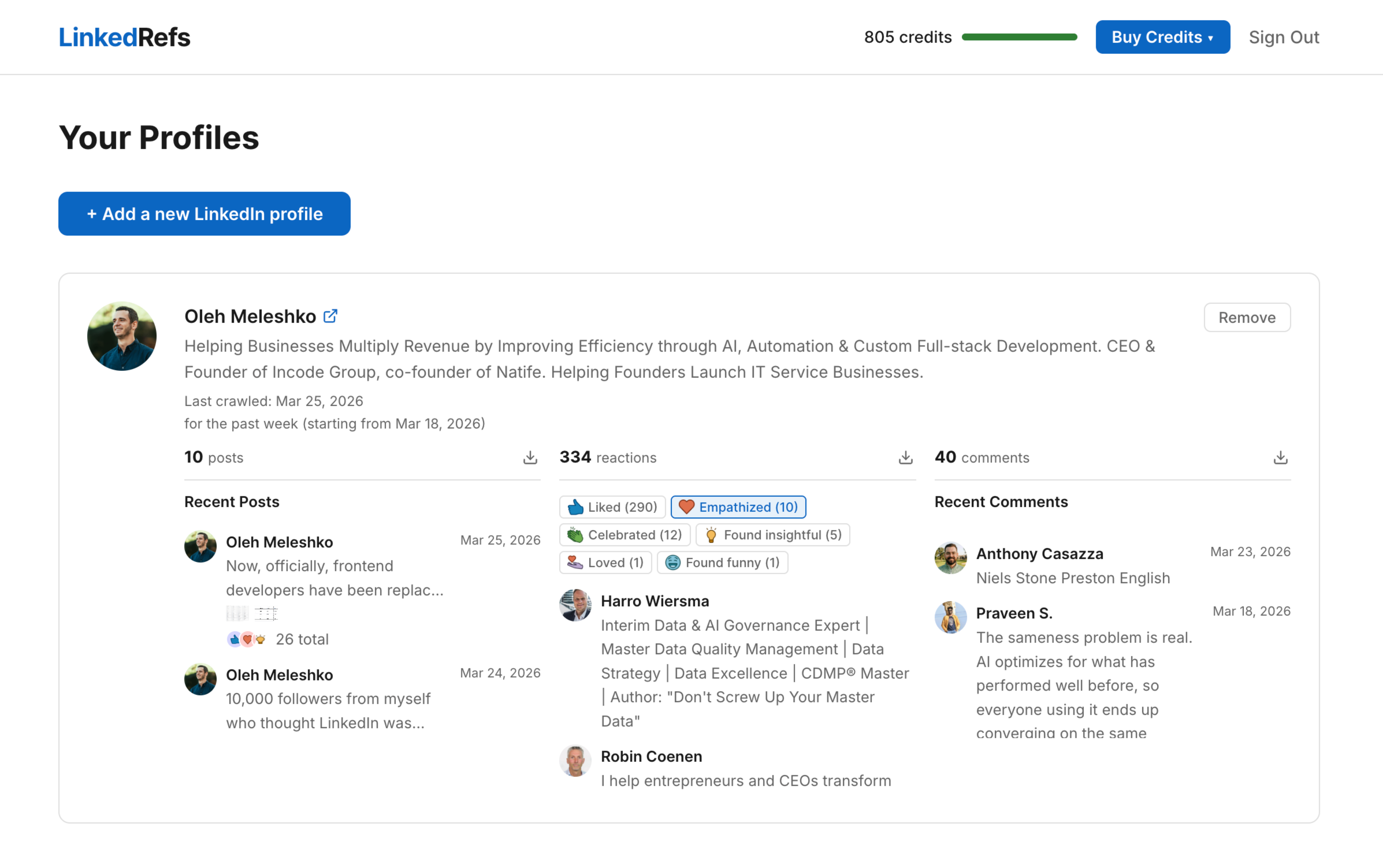 LinkedRefs is a platform that helps you monitor and interpret LinkedIn activity at the profile level. Instead of relying on static data or occasional updates, it tracks real engagement like posts, comments, and reactions to give you a clearer understanding of what your prospects care about and when they are most active.